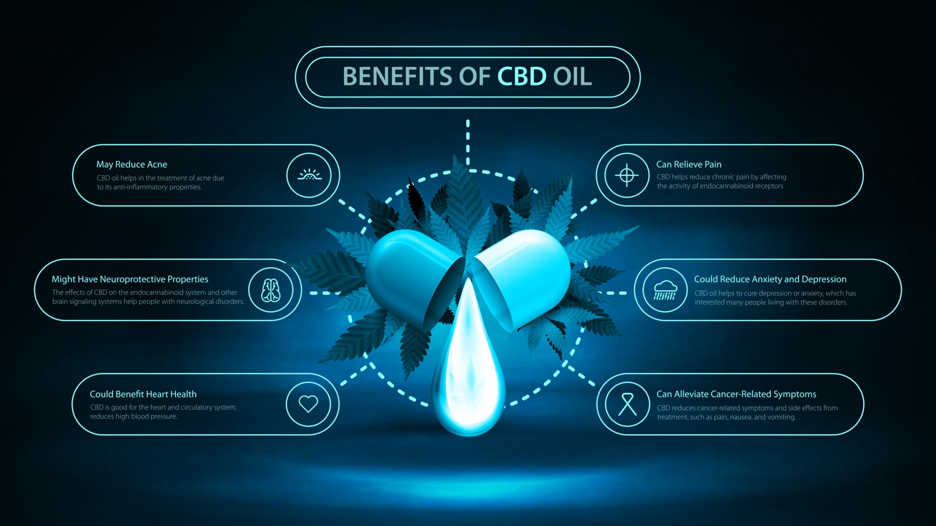 Dark And Blue Digital Information Poster Of Medical Uses For Cbd Oil Benefits Of Use Cbd Oil Poster With Dark Neon Scene Fog Drop Of Cbd Oil Leafs Of Cannabis And Modern